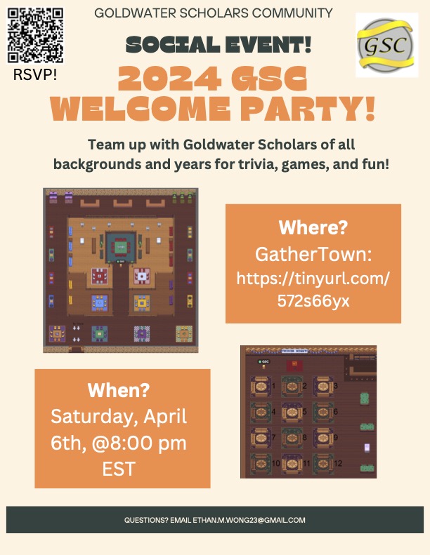 The Social Events and Mentorship committees are organizing an Online Application Workshop. This event is perfect for those applying to graduate programs, medical schools, or global fellowships (e.g., Fulbright, Rhodes, Churchill). It’s a great opportunity to receive on-demand feedback on your applications and network with experienced members of the Goldwater community. If you don’t have an application ready, you can still join to start brainstorming!