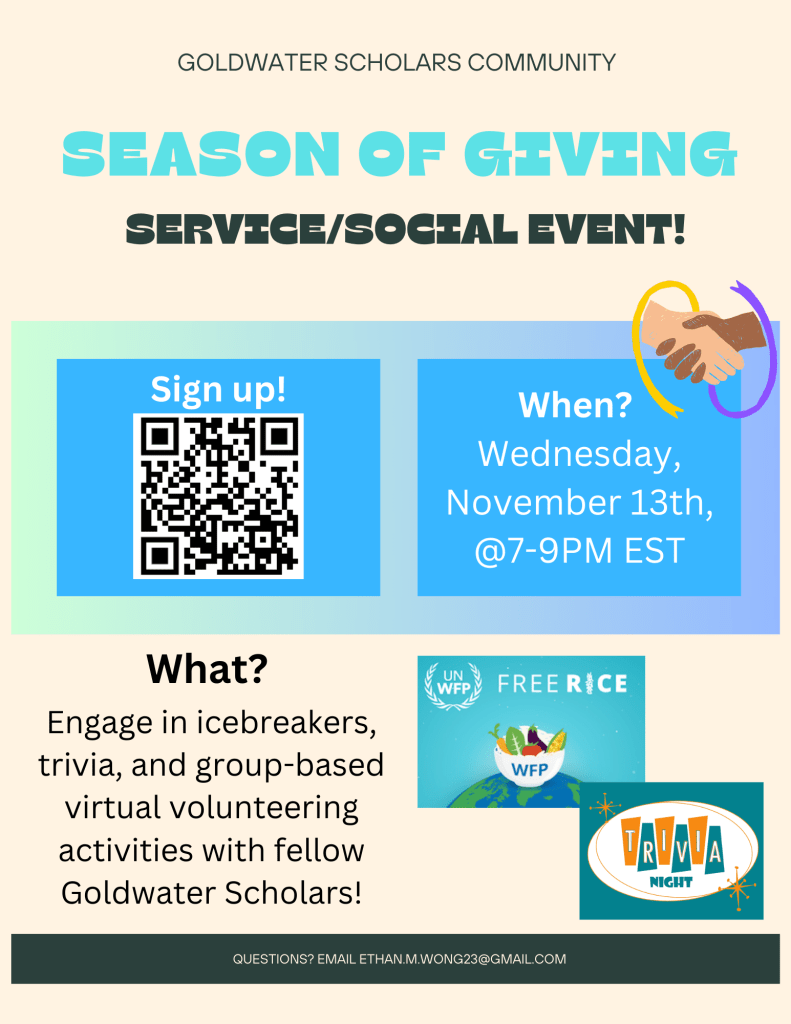 The GSC Social Events Committee will be hosting our “Season of Giving” service/social event this year on November 13th from 7-9 PM EST! We will be hosting icebreakers, trivia, and group-based virtual volunteering activities throughout the event. If you’re interested in meeting other members of the Goldwater Scholars community, love trivia, and/or enjoy giving back to broader communities via online service activities (e.g., Freerice, Zooniverse), we’d love for you to join!